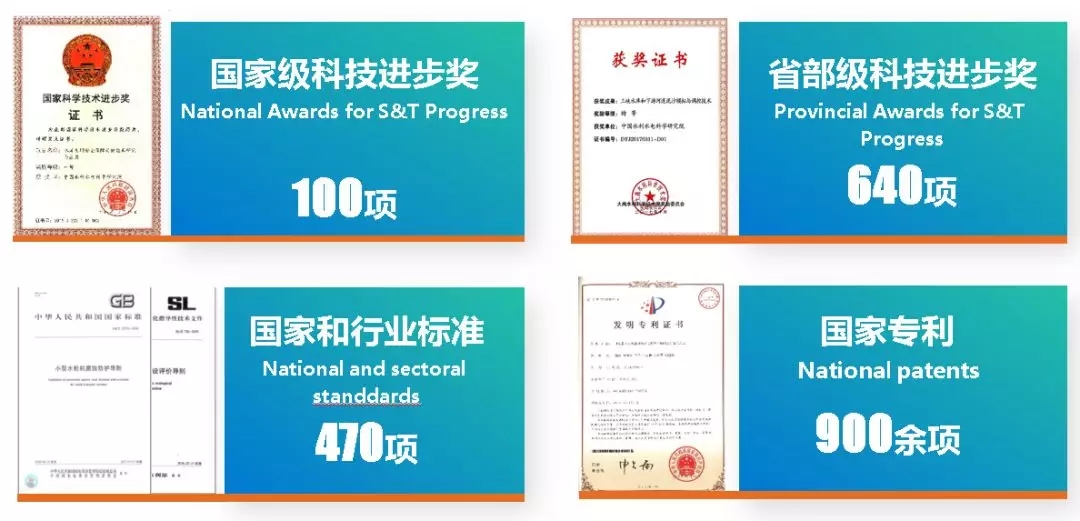 100项成果荣获国家级科技进步奖励、640余项成果荣获省部级科技进步奖励,主编或参编国家及行业标准470项,获得国家专利900余项。学科优势日益凸显,其中泥沙、水资源、坝工技术等从理论到实践,已进入国际领先或先进行列。