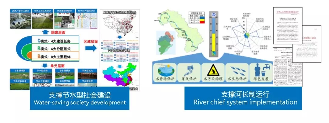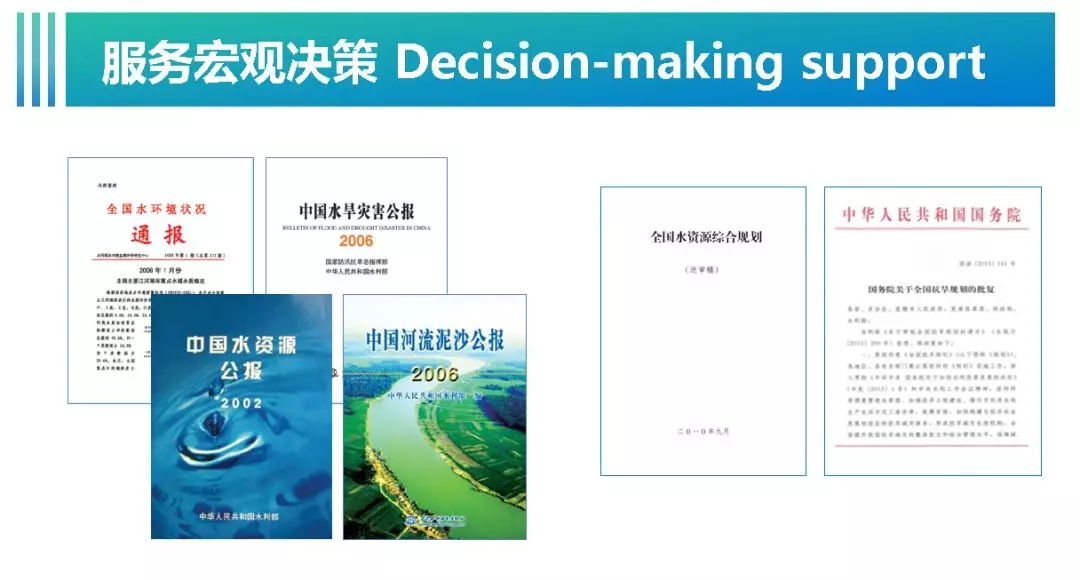 参与编制节水型社会建设方案、生态文明试点城市建设方案、实施最严格水资源管理制度、河湖长制实施方案等,为国家和行业科学决策与管理提供了强有力的科技服务与支持。