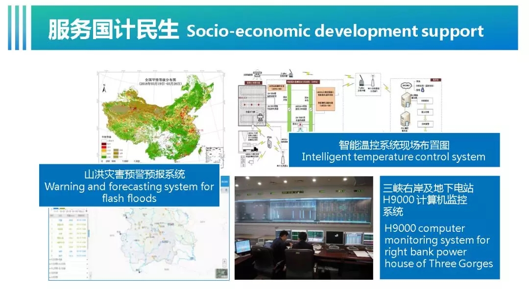 在服务国计民生方面。研发了洪水风险分析与决策系统、山洪灾害预警预报系统、旱情遥感监测系统、水污染预警预报系统、工程安全智能温控系统、水电站自动化监控系统等。