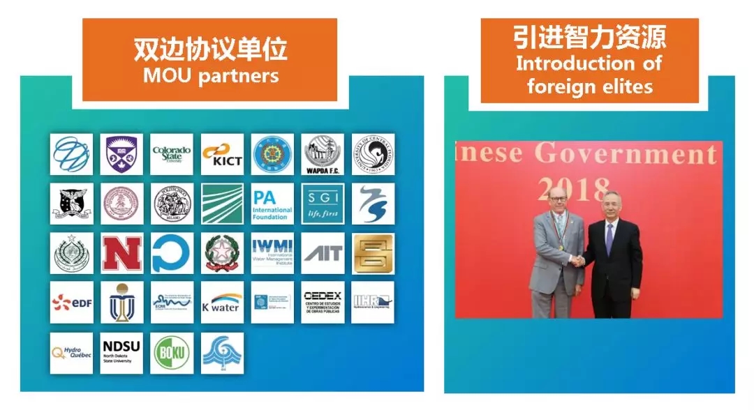 与国外近40余家科研机构、知名大学、国际组织和企业签订了固定的科技合作机制。积极引进国外智力资源,特聘外籍专家Christopher George 先生喜获中国政府友谊奖。有10余位专家在国际组织内担任荣誉主席、副主席、秘书长等重要职务,极大提升了国际涉水事务的影响力和话语权。