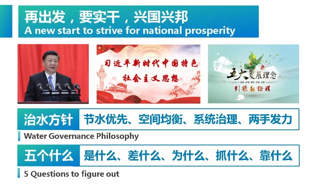 再出发,要实干,兴国兴邦。要高举习近平新时代中国特色社会主义思想伟大旗帜,站在更高起点谋划和推进水利水电科技发展。深入贯彻“创新、协调、绿色、开放、共享”发展理念、积极践行“节水优先、空间均衡、系统治理、两手发力”治水方针,努力搞清楚“五个什么”、切实找准解决新老水问题的关键环节,锐意进取、勇攀高峰,谱写科技兴水新篇章。