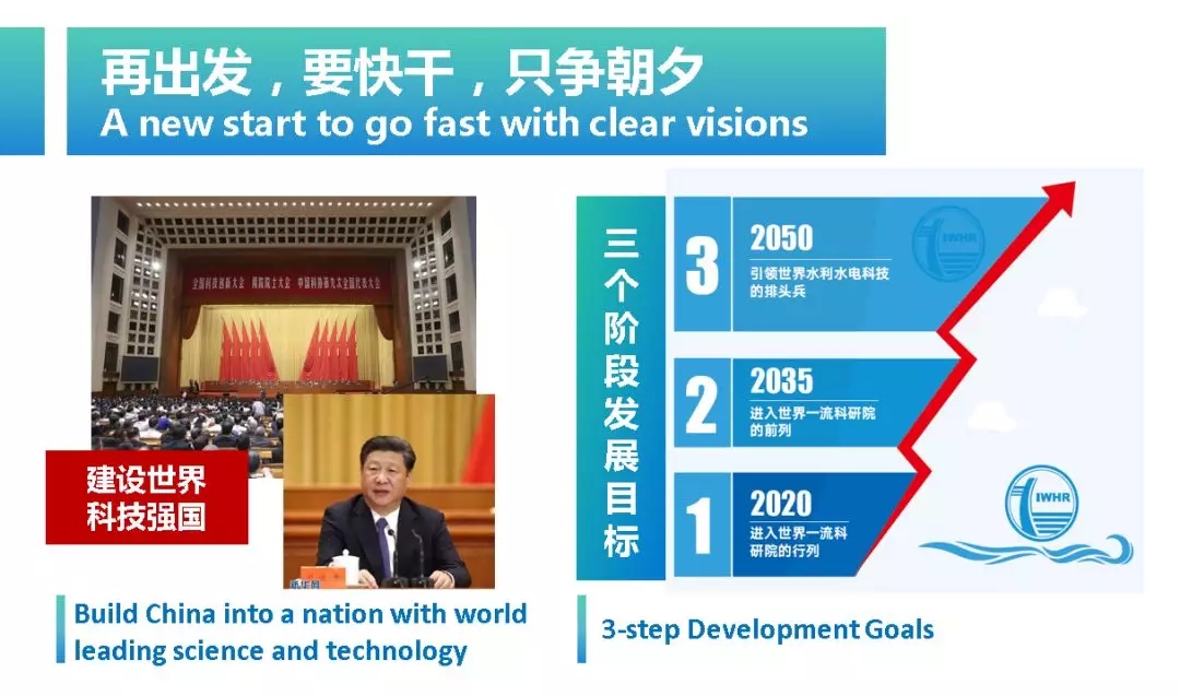 再出发,要快干,只争朝夕。要贯彻习近平总书记关于建设世界科技强国三步战略,朝着实现我院提出的三个阶段发展目标而不懈努力,即到2020年,进入世界一流科研院的行列,到2035年,进入世界一流科研院的前列,到2050年,成为引领世界水利水电科技的排头兵。