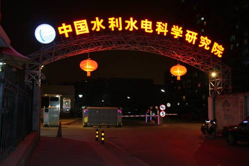 夜间“水之蓝”圆形院徽彰显出我院数十年发展而大成,勃然中兴,运势昌隆,一字排开的中国水利水电科学研究院的字体形成拱形,字体中LED喷吐红色光源,在夜间星空衬托下,很是端庄耀眼,走在西来入院的路上,夺目一亮就能见到水科院标示。